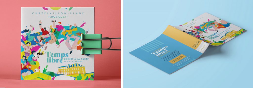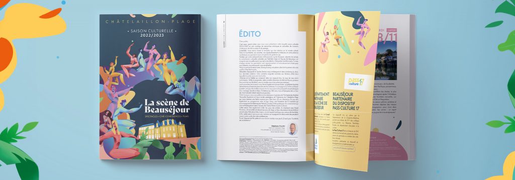 Illustrations dynamiques, typographies élégantes et mise en page fluide viennent habiller le programme de saison, les affiches et les supports associés. Un univers graphique joyeux et moderne, pensé pour séduire un large public, du passionné de théâtre au curieux du coin.